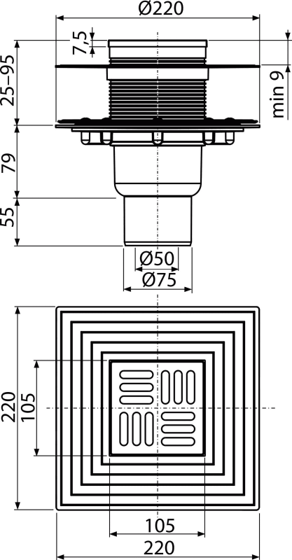 APV0300Drain throat, grid 105×105 mm steel
