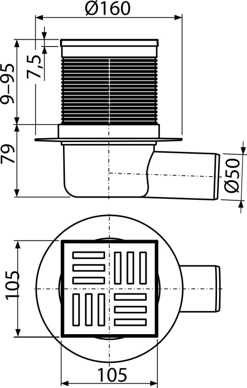 - Корпус сливного трапа с боковым подключением к стоку Ø50 мм