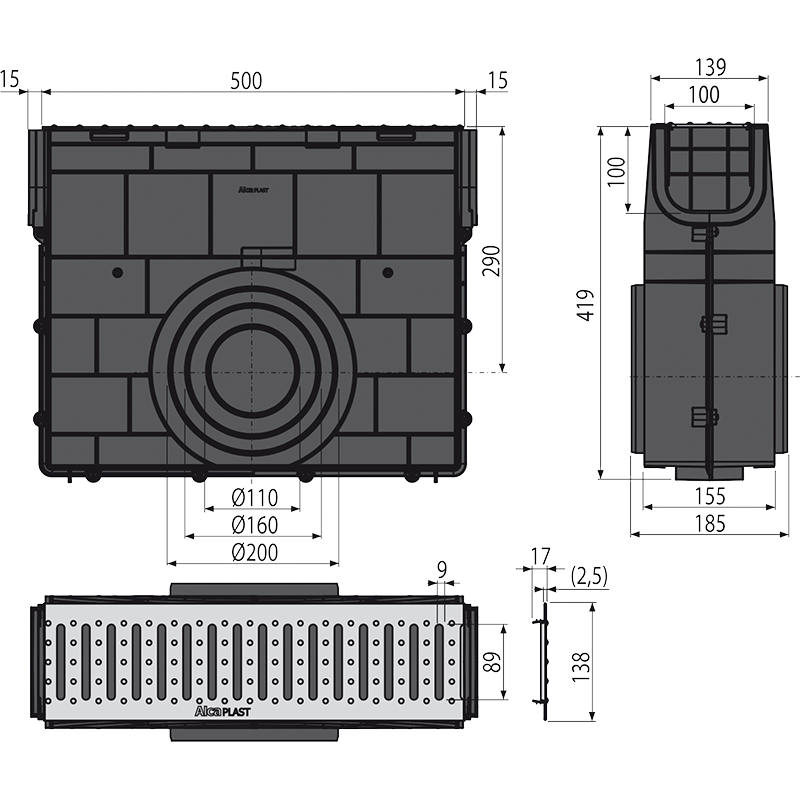 • Боковое подключение к канализационному стоку Ø110, 160, 200 мм