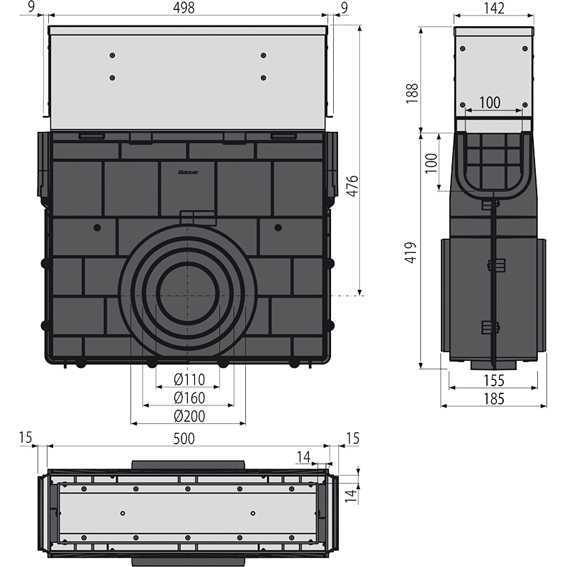 - Боковое подключение к канализационному стоку Ø110, 160, 200 мм