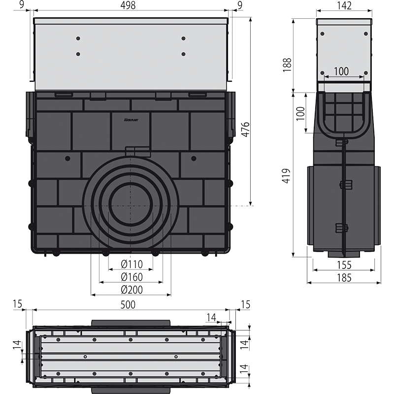 - Боковое подключение к канализационному стоку Ø110, 160, 200 мм