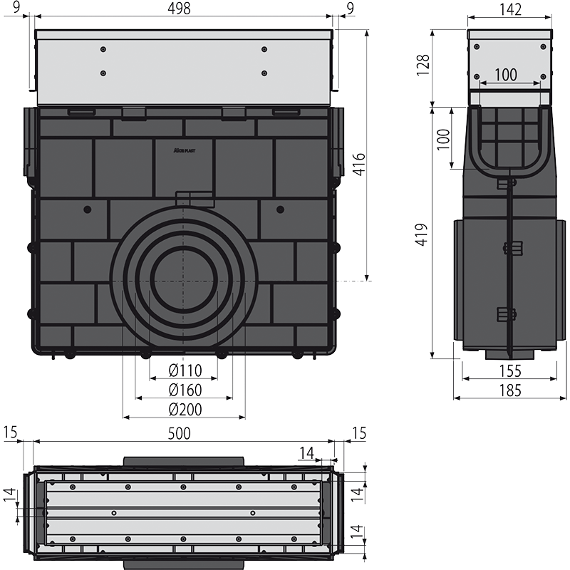 - Боковое подключение к канализационному стоку Ø110, 160, 200 мм