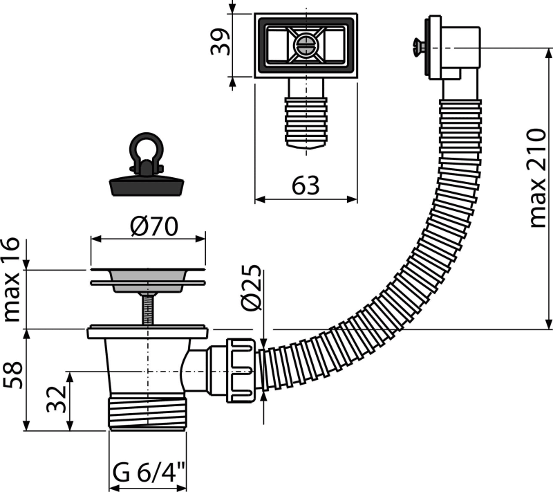 Донный клапан сифона для мойки 6/4" c решеткой из нержавеющей стали DN70 и гофропереливом