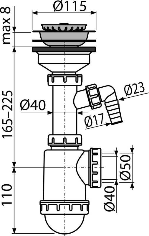Сифон для мойки c решеткой из нержавеющей стали DN115 и штуцером