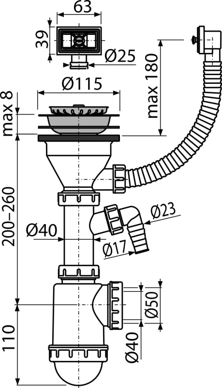 • Возможность подключения канализационной трубы Ø50 или Ø40 мм