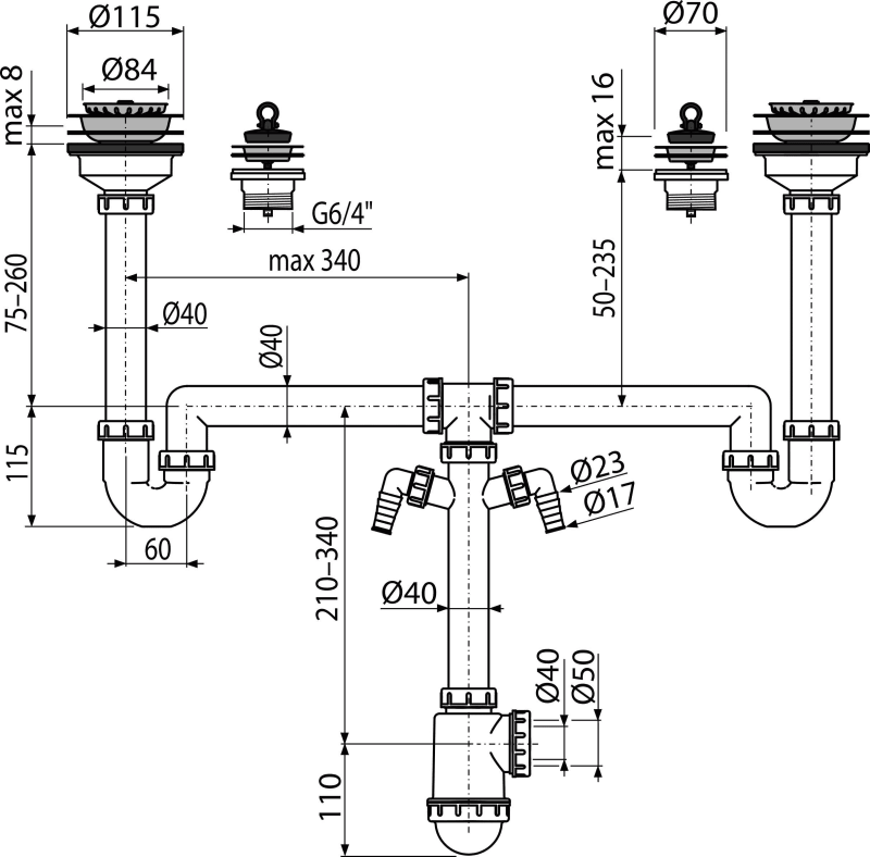 • Возможность подключения канализационной трубы Ø50 или Ø40 мм