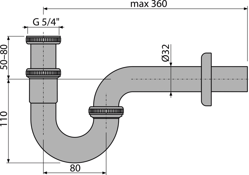 Сифон для умывальника DN32, U-форма с накидной гайкой 5/4", металл