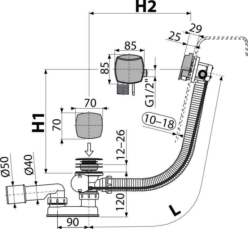 Сифон для ванны с напуском воды через перелив для ванн с толстыми стенками, хром