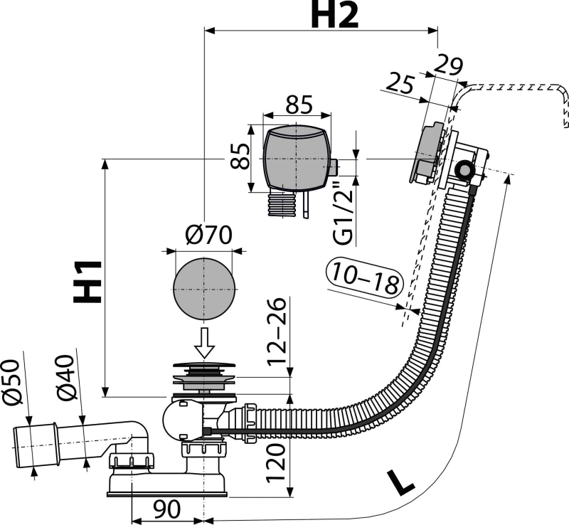Сифон для ванны с напуском воды через перелив для ванн с толстыми стенками, металл